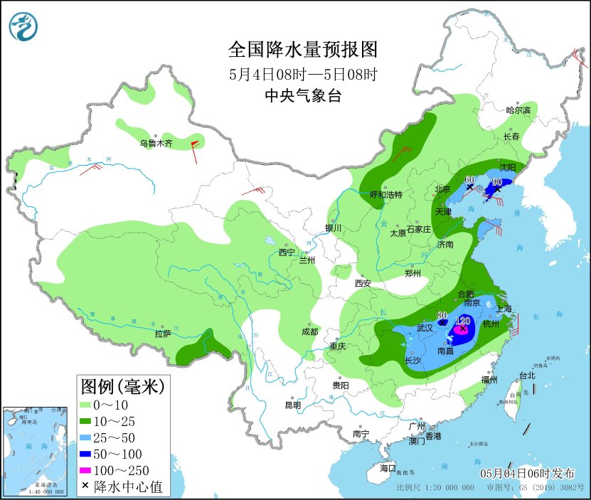 5月4日08时至5日08时,湖北南部和东部、安徽南部、湖南东北部、江西中北部、浙江西部、江苏南部以及山东半岛、辽宁南部、河北东部等地部分地区有大到暴雨,其中,安徽南部、江西北部等地部分地区有大暴雨(100~120毫米)。上述部分地区伴有短时强降水(最大小时降雨量20~40毫米,局地可超过50毫米),局地有雷暴大风等强对流天气。内蒙古中部、黑龙江东北部、新疆南疆盆地、甘肃河西、山东半岛等地部分地区有4~6级风,其中,新疆东部部分地区有8~9级风。渤海、渤海海峡、黄海大部、东海北部海域将有7~8级、阵风9~10级的大风。