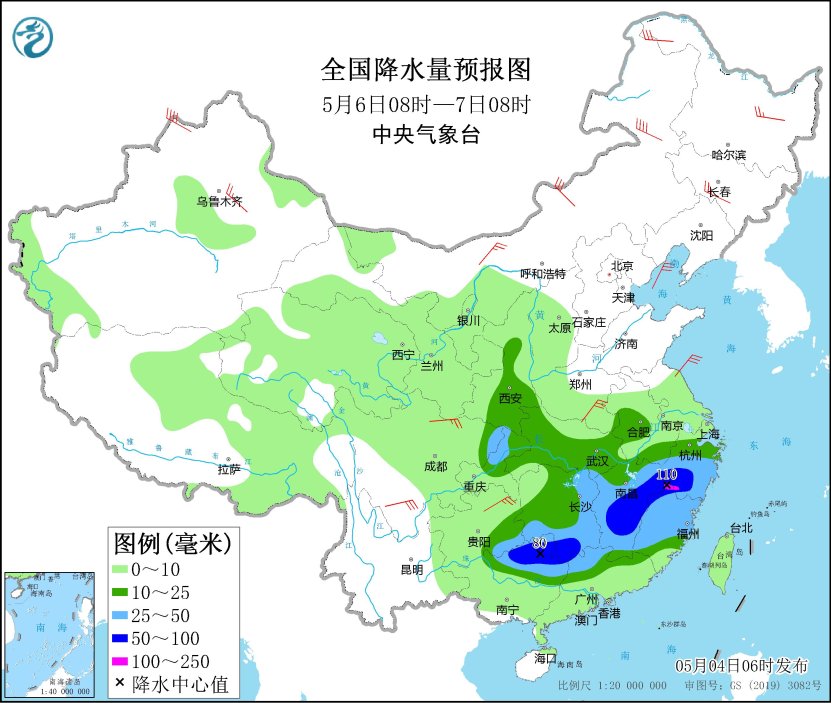 5月6日08时至7日08时,陕西中南部、江汉大部、江淮西部、江南、西南地区东北部、华南北部等地部分地区有中到大雨,其中,湖南南部、江西中部和东北部、浙江西南部、福建西北部、广西北部等地部分地区有暴雨或大暴雨(100~110毫米)。内蒙古中部和西北部、黑龙江东北部、吉林中部、新疆沿天山地区、河南南部、四川盆地西北部、四川南部、贵州东北部等地部分地区有4~6级风,其中,内蒙古东北部、新疆北疆北部等地部分地区有6~7级风。