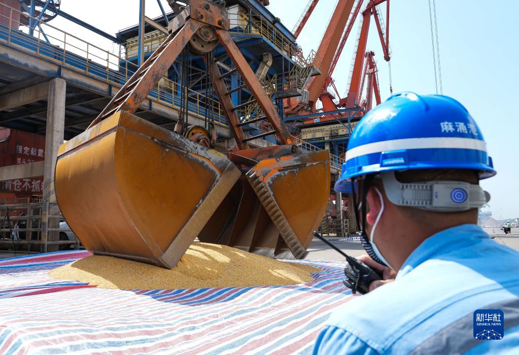 5月4日,首船进口南非饲料玉米抵达广东麻涌港后,工作人员指挥吊机从船上卸下玉米接受检验检疫。