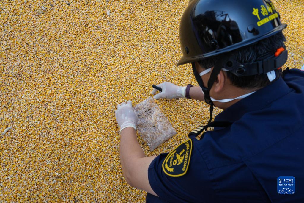 5月4日,海关检验检疫工作人员在广东麻涌港对首船进口南非饲料玉米进行筛样检查。