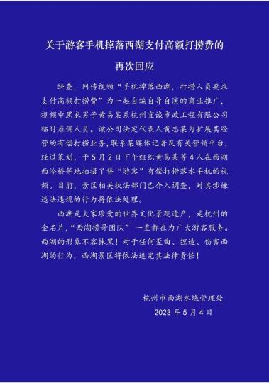 针对该视频中反映的情况,5月4日,杭州市西湖水域管理处再次回应称,经查,网传视频“手机掉落西湖,打捞人员要求支付高额打捞费”为自编自导自演的商业推广。视频中黑衣男子黄易某系杭州宜诚市政工程有限公司临时雇佣人员。该公司法定代表人黄志某为扩展其经营的有偿打捞业务,联系某媒体记者及有关营销平台,经过策划,于5月2日下午组织黄易某等4人在西湖西冷桥等地拍摄了替“游客”有偿打捞落水手机的视频。目前,景区相关执法部门已介入调查,对其涉嫌违法违规的行为将依法处理。