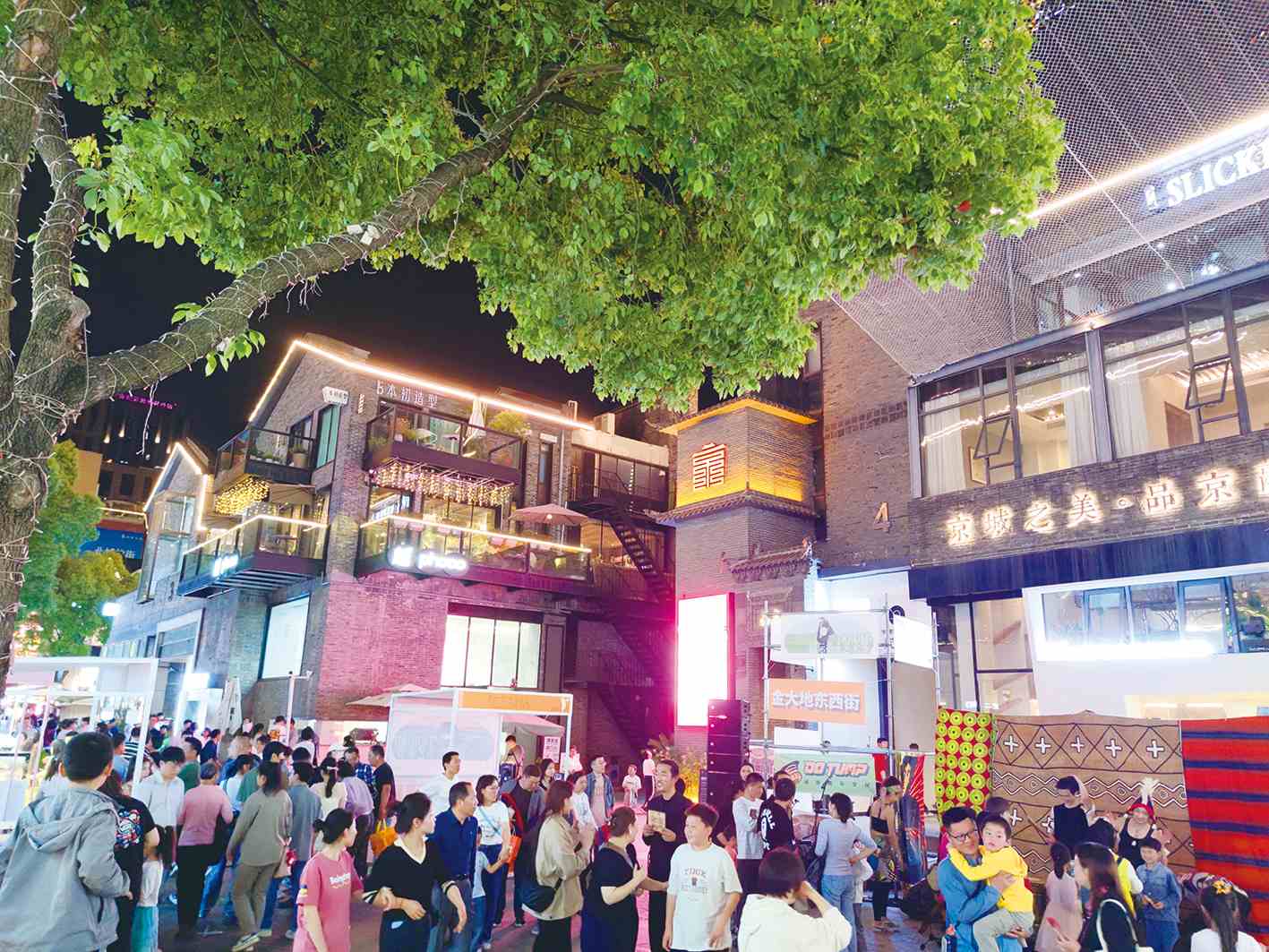 深夜,在街区四周,美食摊位相继搭建,游客们簇拥围坐,袅袅烟火,感受着人间最真实的存在。“在这个街区,既能体验中国城市的市井烟火气,同时又能感受世界文化艺术,相互碰撞,氛围感非常奇妙。”韩国游客任昌奎说。