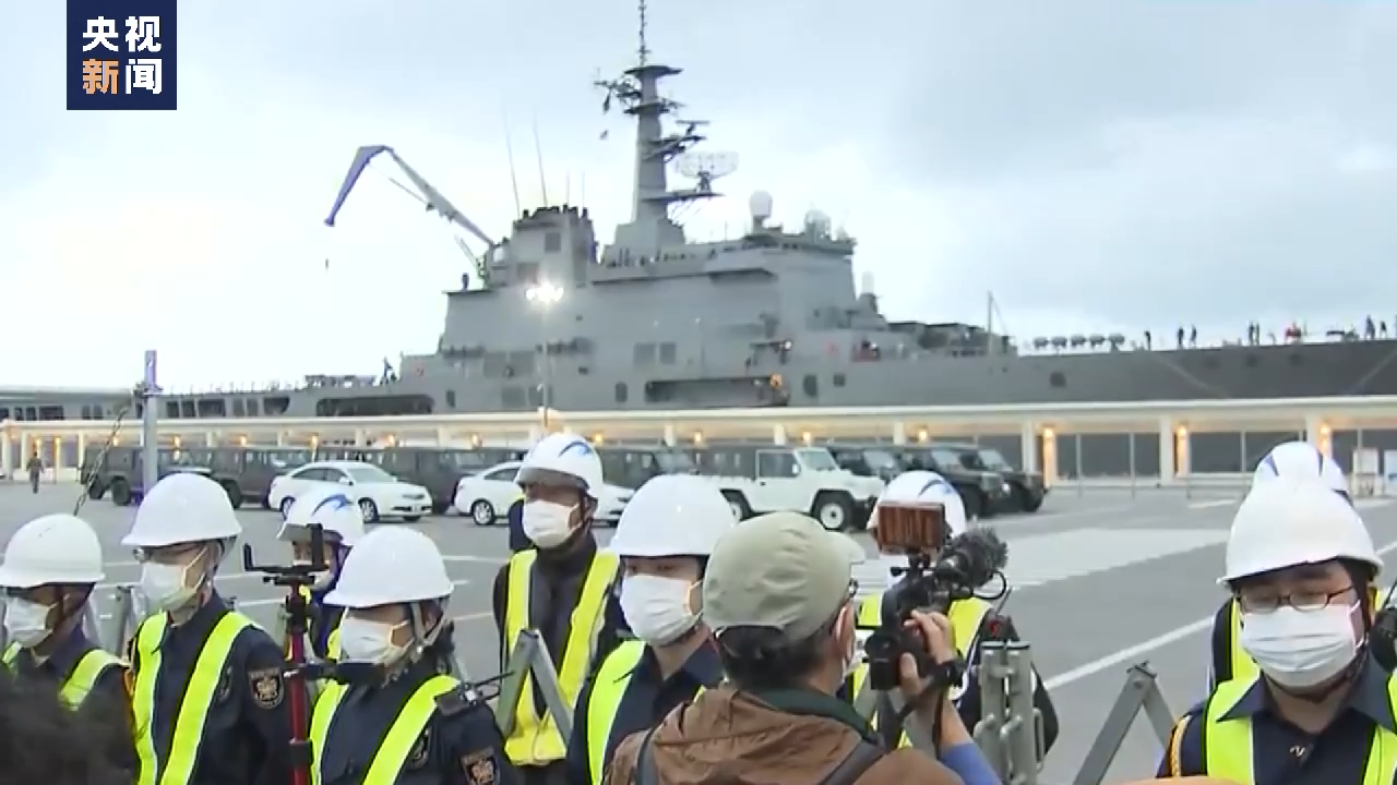 3月18日,海上自卫队“大隅”号运输舰停靠石垣港码头,数十辆卡车陆续驶入石垣岛的日本自卫队基地。