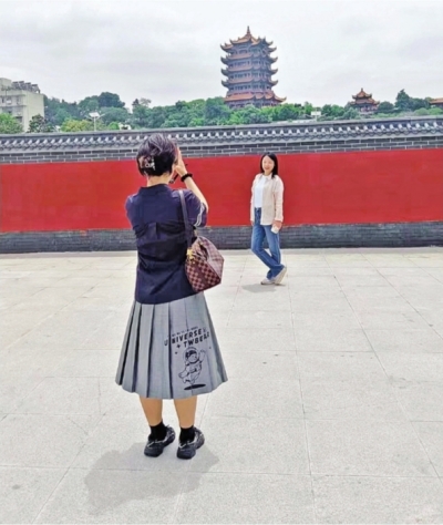 来自四川的刘女士站在红墙前,让同伴接连拍下了十多张照片,离开时还意犹未尽。刘女士表示:“红墙、黄鹤楼同框,太美了,拍出了满满的大片感。”