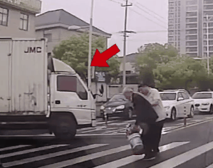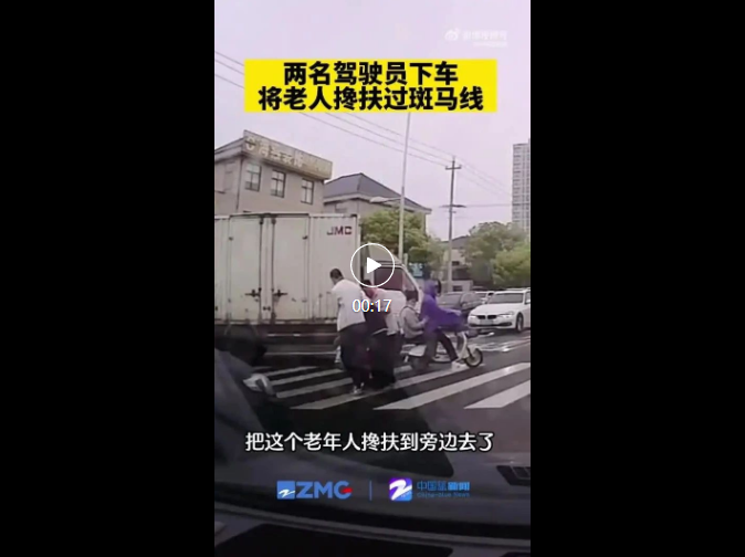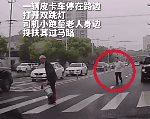与皮卡车司机一起护送老人过马路