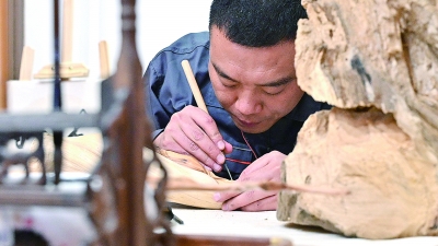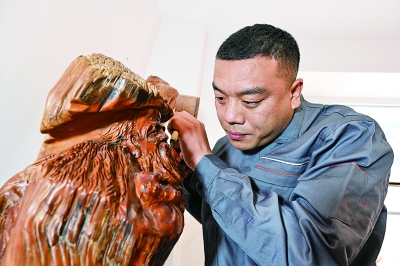 许红阳虽是“90后”,却处处透出成熟与稳重。“从小跟着父亲去深山里寻找雕刻木材,自然皮肤黝黑。有时雕刻一个细节,五六个小时不吃不喝,都忘了戴防尘面罩,导致现在说话有些沙哑。”