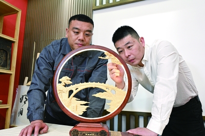 许红阳和同事商量改进赵州桥禅意灯的木雕工艺