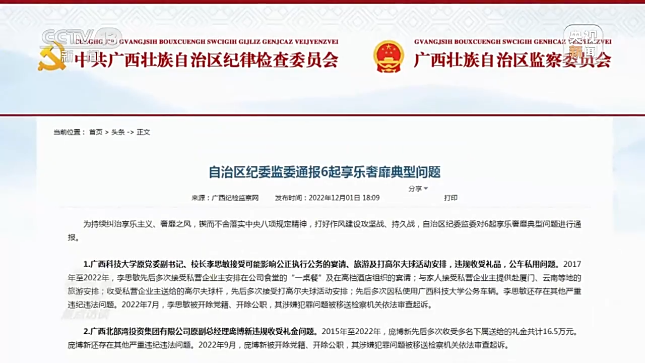 在广西通报的案例中,陆劲忠在2016年至2022年,先后多次收受多名管理和服务对象、私营企业主送给的高档香烟、高档酒水等礼品,折合共计13.05万元。