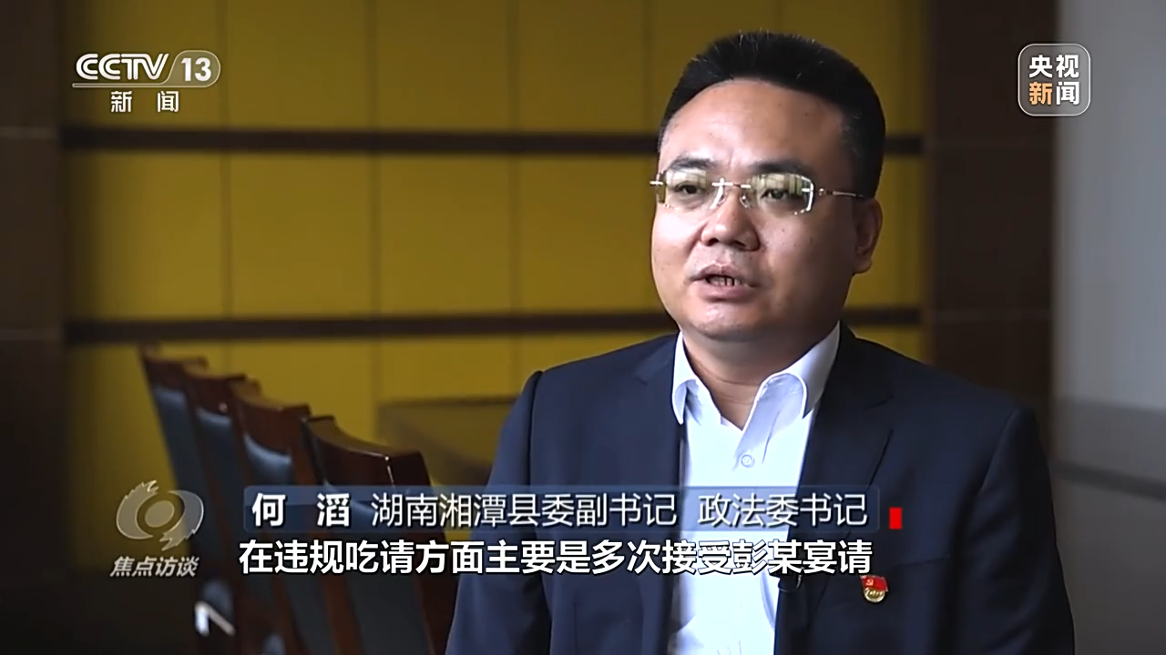 湖南省湘潭县委副书记、政法委书记 何滔:在违规吃请方面主要是多次接受彭某宴请,而且他的宴请形式具有一定的隐秘性和欺骗性,也就是成凯夫妻经常和彭某夫妻,两家人以家庭聚会的名义在家里、会所或者其他地方聚餐。