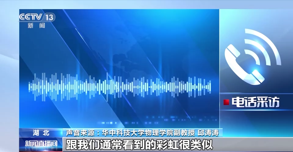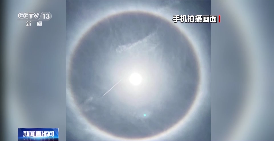 华中科技大学物理学院副教授 邱涛涛:它的原理本质上跟我们通常看到的彩虹很类似,高空中它可能会有一些水蒸气,水蒸气的密度比较大,温度比较低,有可能会形成一些冰晶,太阳光经过这些冰晶的时候也会被折射,恰好形成一定的角度,通常来说是22°的比较多,就会在它周围产生这样一个光环。