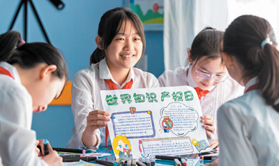 在2023年全国知识产权宣传周期间,内蒙古自治区呼和浩特市玉泉区恒昌店巷小学学生向同学展示知识产权手抄报。 丁根厚摄