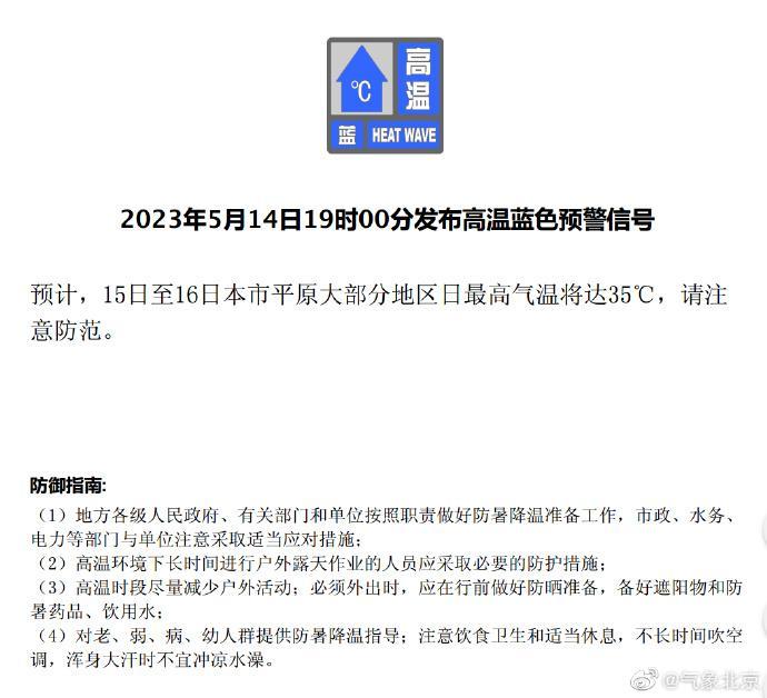 图为北京市气象台发布的高温蓝色预警信号。北京市气象局官方微博