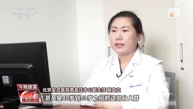 北京安贞医院高血压中心副主任 程文立:20岁到39岁,甚至是40岁到59岁之间的这部分人群,是我们高血压病的主力的人群,提醒中青年阶段,很容易发展成为高血压,一定要重视自己生活方式的干预。