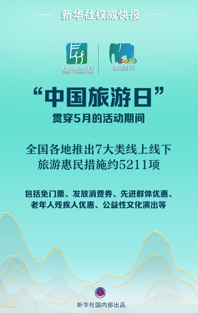 记者从文化和旅游部了解到,“中国旅游日”活动期间,全国各地推出7大类线上线下旅游惠民措施约5211项,包括发放文化和旅游消费券;旅游企业推出优惠措施;旅游助老、助残措施;对劳动模范等先进群体的优惠措施;公益性文艺演出、公共文化场馆扩大开放等。优惠活动贯穿整个5月。