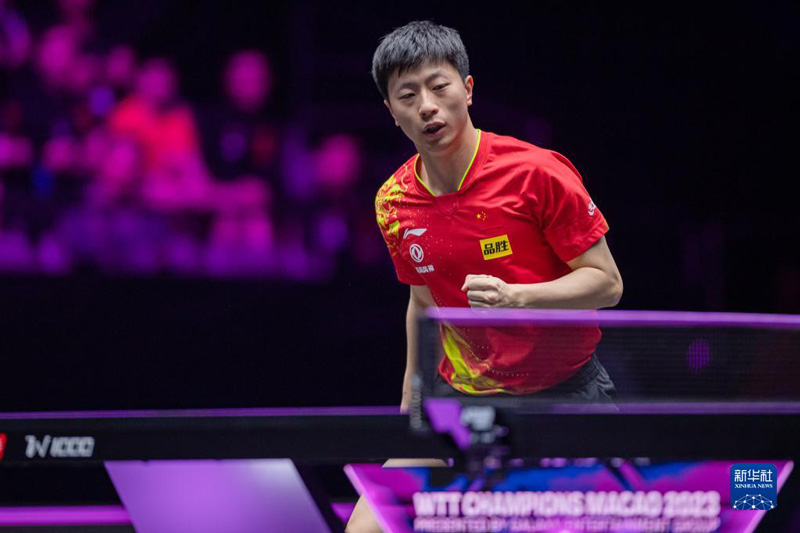 2023年4月22日,马龙在比赛中。当日,在澳门塔石体育馆举行的2023世界乒乓球职业大联盟(WTT)澳门冠军赛男子单打半决赛中,中国选手马龙以4比1战胜法国选手艾利克斯·勒布伦,晋级决赛。新华社记者 张金加摄