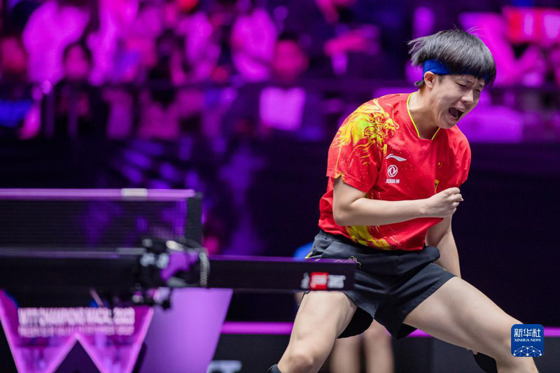 2023年4月23日,王曼昱在比赛中庆祝得分。当日,在澳门塔石体育馆举行的2023世界乒乓球职业大联盟(WTT)澳门冠军赛女子单打决赛中,中国选手王曼昱以4比2战胜队友陈梦,夺得冠军。新华社记者 张金加摄