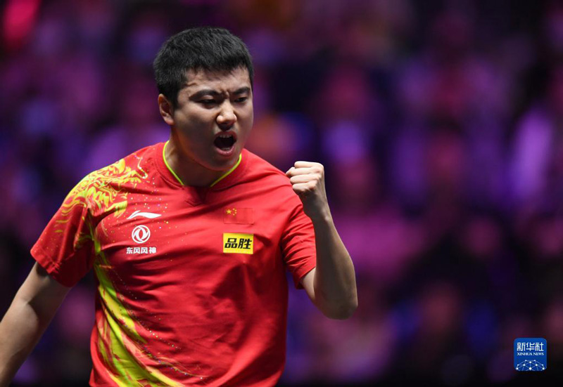2023年4月14日,梁靖崑在比赛中庆祝得分。当日,在河南新乡举行的世界乒乓球职业大联盟(WTT)新乡冠军赛男单半决赛中,中国选手梁靖崑以4比2战胜中国台北选手林昀儒,晋级男单决赛。新华社记者 李嘉南摄
