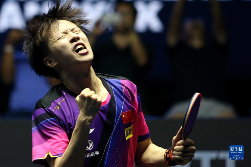 2023年4月23日,中国选手王楚钦庆祝得分。当日,在澳门塔石体育馆举行的2023世界乒乓球职业大联盟(WTT)澳门冠军赛男子单打决赛中,中国选手王楚钦以4比0战胜队友马龙,夺得冠军。新华社记者 张金加摄