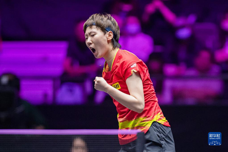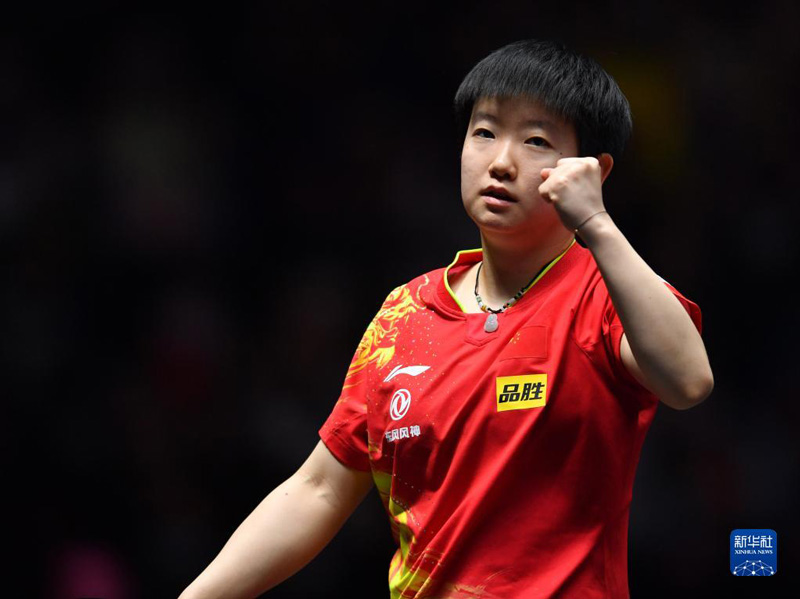 2023年4月15日,孙颖莎庆祝比赛获胜。当日,在河南新乡举行的世界乒乓球职业大联盟(WTT)新乡冠军赛女单决赛中,中国选手孙颖莎以4比1战胜队友王艺迪,夺得冠军。新华社记者 李嘉南摄
