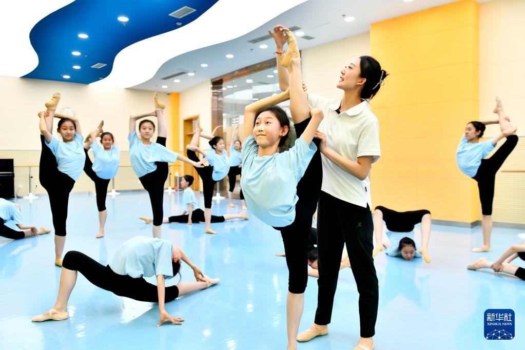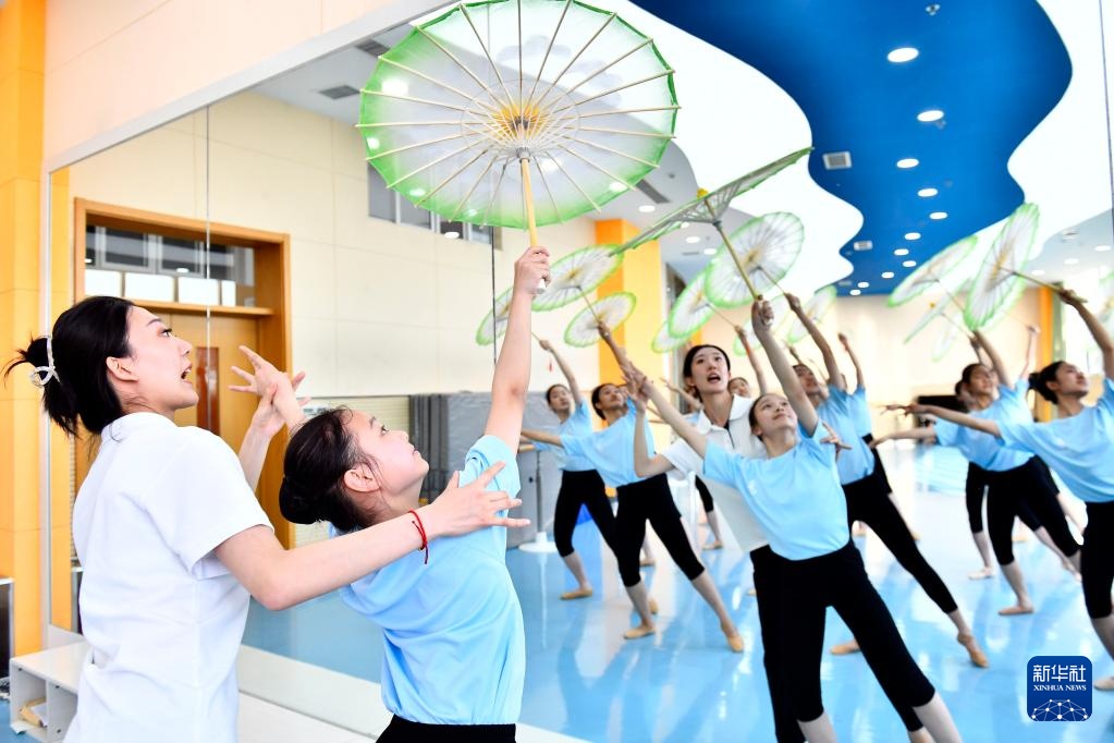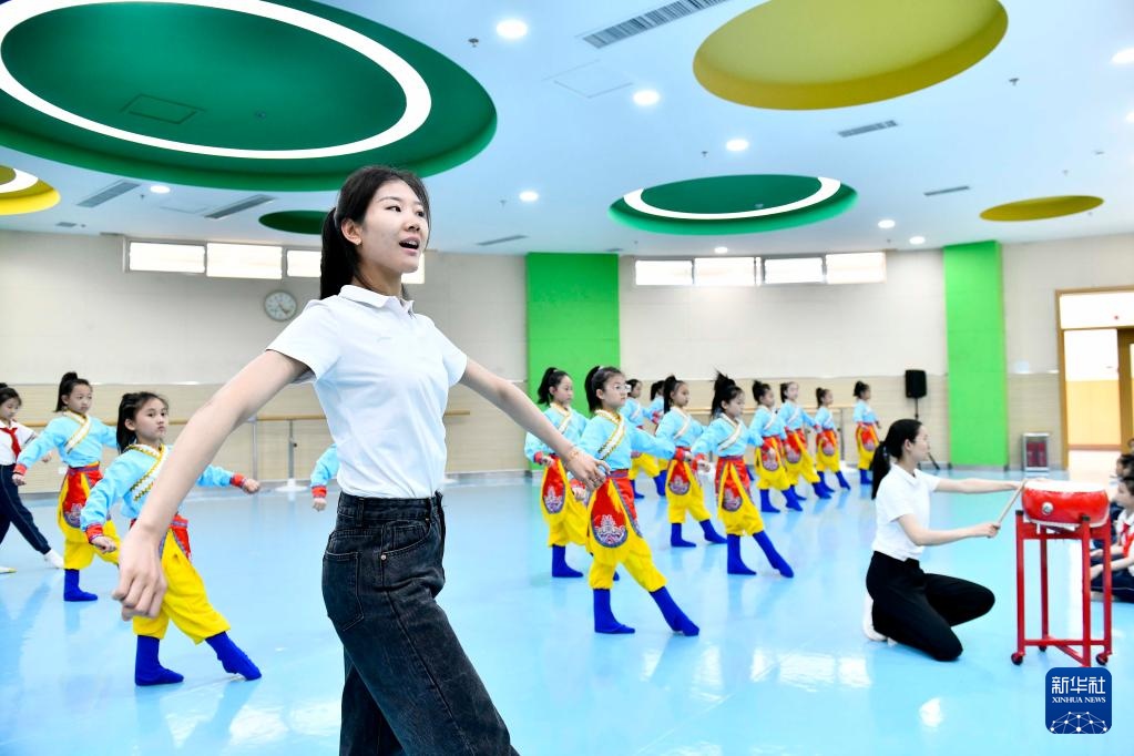 5月23日,在济南市历城二中闻韶艺术馆,于恩赐老师带着同学们在练习舞蹈。