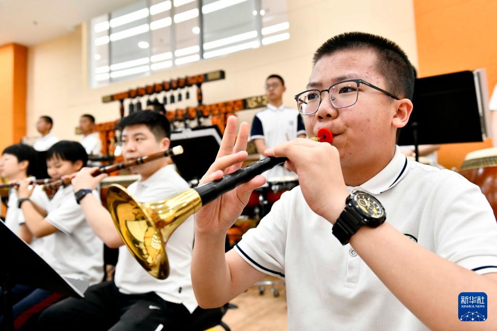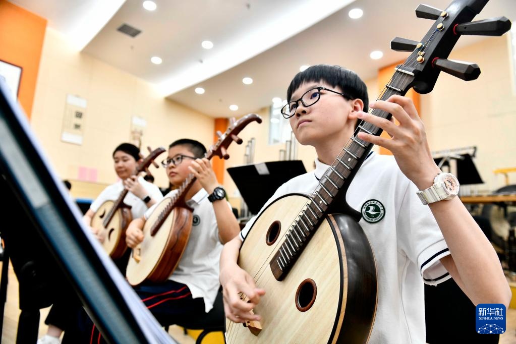 5月23日,在济南市历城二中闻韶艺术馆,同学们在练习国乐曲目。