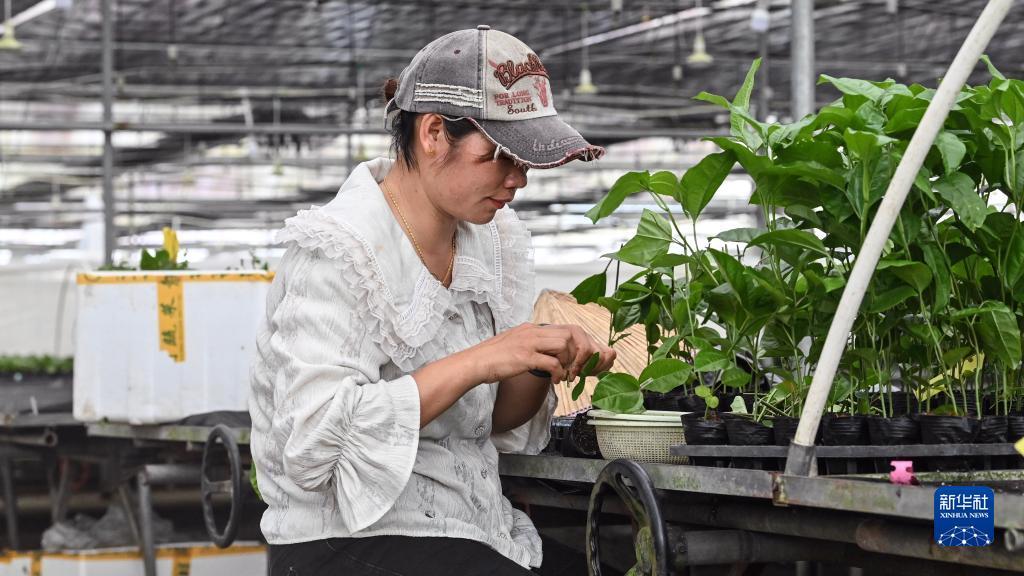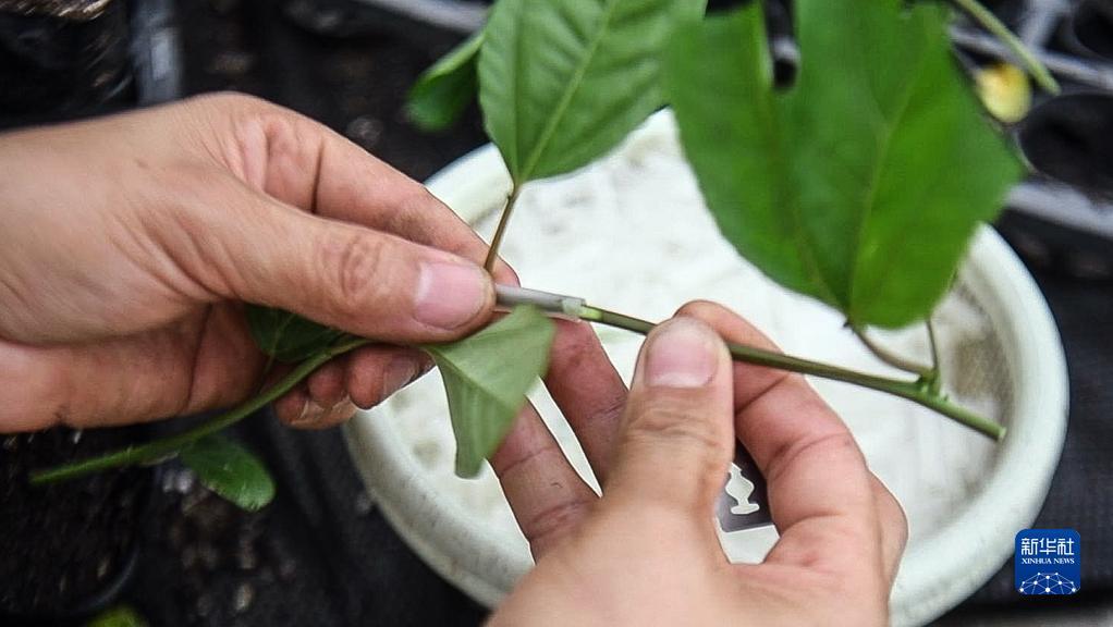 在“木瓜哥”的智能大棚内,一名村民在嫁接黄金百香果苗(5月25日摄)。