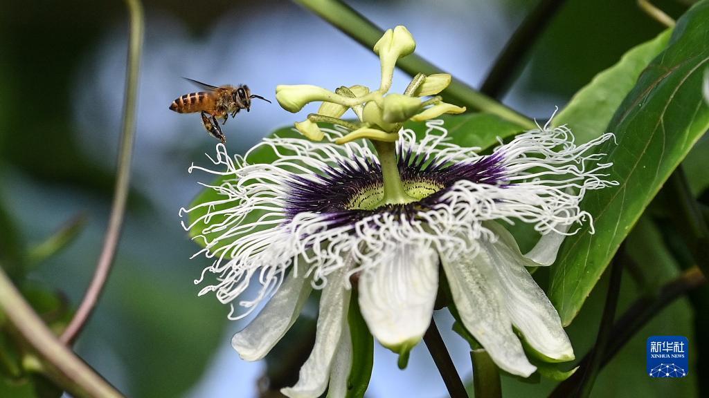 钦州市钦南区犀牛脚镇乌雷村的黄金百香果园内百香果花盛开(5月25日摄)。