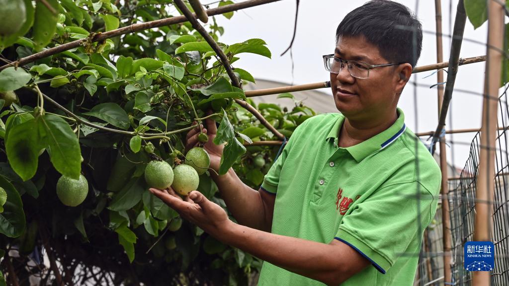 在钦州市钦南区犀牛脚镇大坪村一户庭院内,“木瓜哥”查看黄金百香果长势(5月25日摄)。
