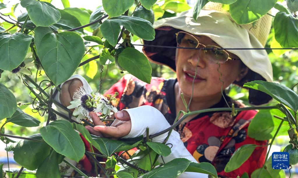在钦州市钦南区乌雷村的黄金百香果园,钦南区水果产业发展中心工作人员查看百香果花(5月25日摄)。