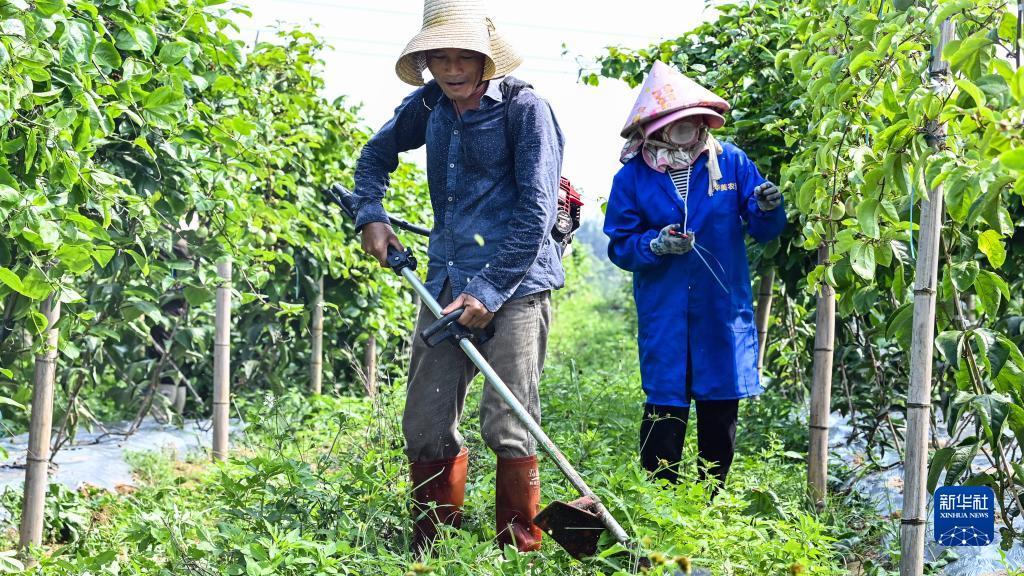 在钦州市钦南区犀牛脚镇乌雷村,村民护理黄金百香果园(5月25日摄)。