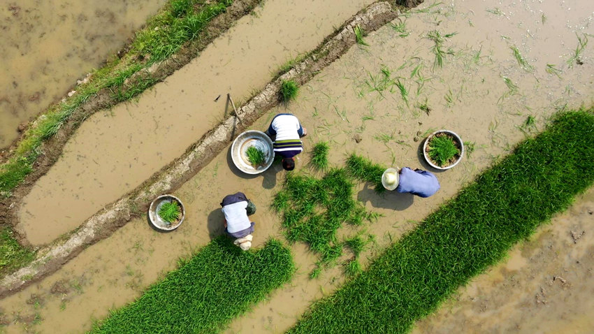 每年的4-5月,插秧就成了当地村民一年农活中举足轻重的“重头戏”。今年,当地村民赶着谷雨过后的好天气抢抓农时,耕田、取秧、抛秧、插秧,确保今年的水田满栽满插。