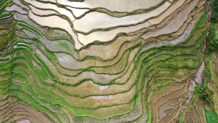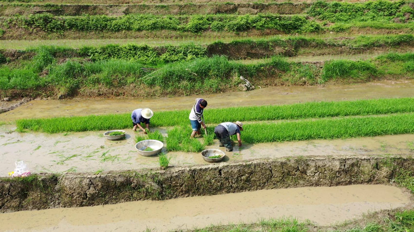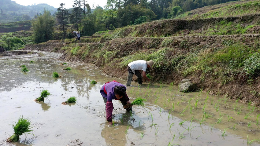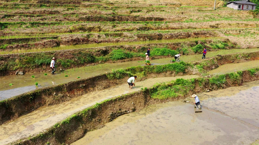四川筠连:千亩梯田美如画 传统劳作插秧忙