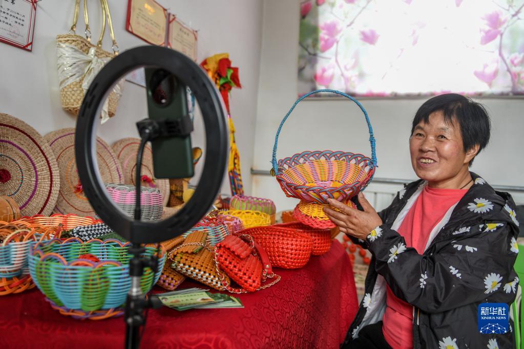 5月26日,孝里街道南黄村村民王殿梅在家中通过电商平台推介自己制作的编织产品。新华社记者 朱峥 摄