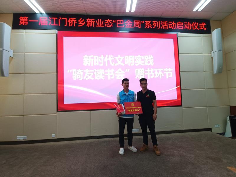 启动仪式上,骑行之家工会主席李能浩介绍了第一届江门侨乡新业态“巴金周”系列活动整体情况。“巴金周”系列活动对象包括新业态劳动者及家庭成员,活动内容有新业态“劳动金句”评选,新业态劳动者征集原创,巴金作品描述地点打卡,新业态劳动家庭“阅读研学游”,新业态劳动者子女朗诵节选,作家协会“巴金作品”讲座等。启动仪式上,江门新业态劳动者新时代文明实践“骑友读书会”成立,骑行之家工会主席李能浩为骑友赠送了书籍。