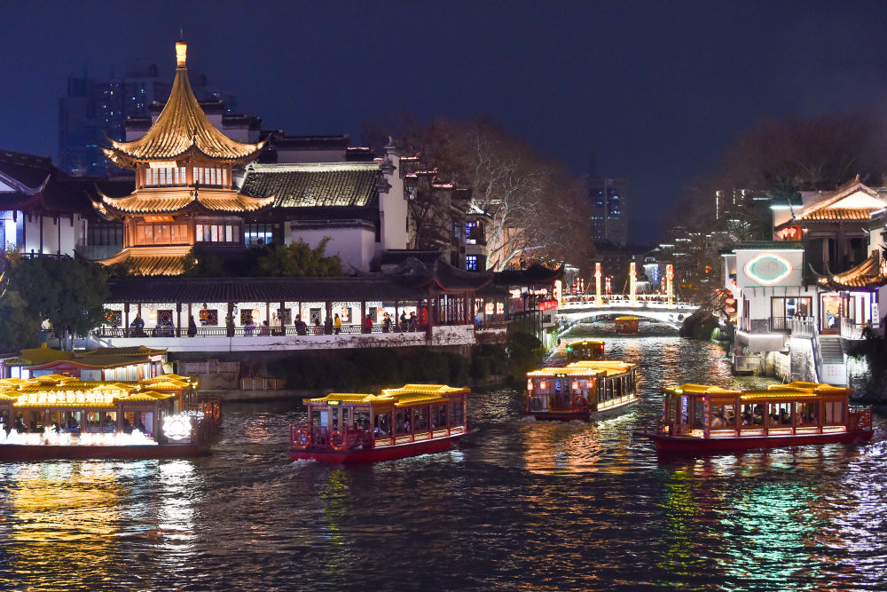 游客在江苏省南京市夫子庙景区乘船夜游秦淮河(2023年2月2日摄)。新华社发(方东旭摄)