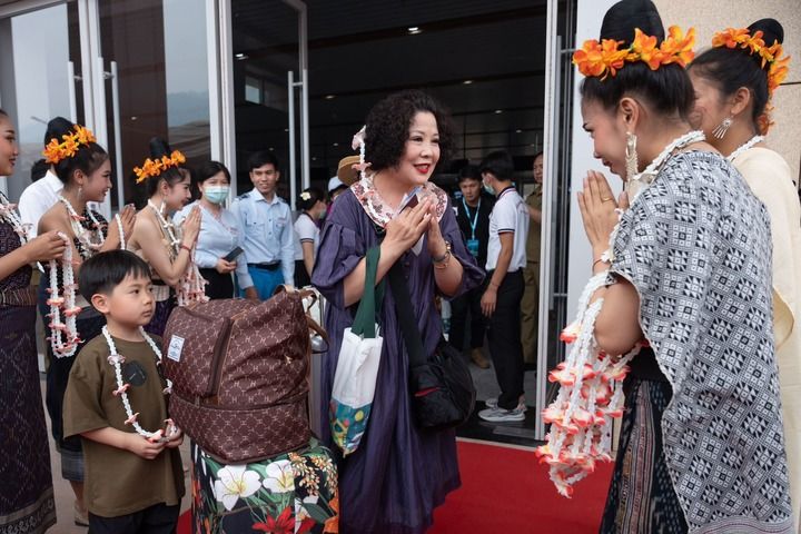 在中老铁路老挝磨丁站,工作人员欢迎乘坐D887次国际旅客列车的旅客抵达磨丁(2023年4月13日摄)。新华社发(凯乔摄)