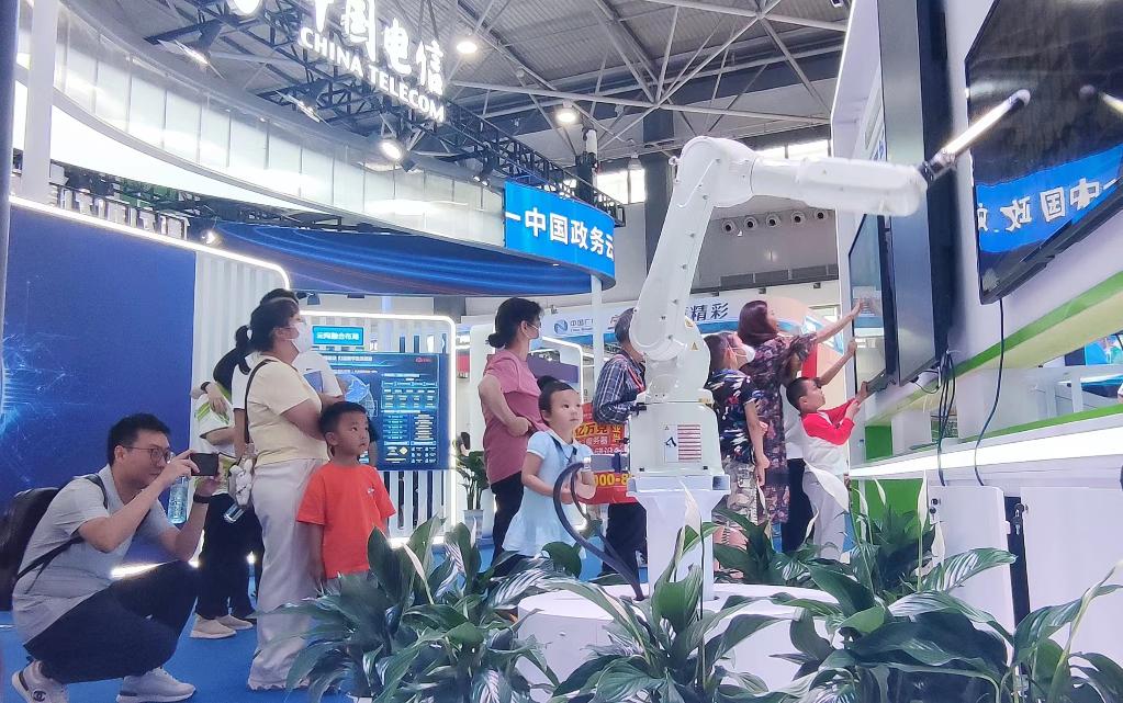 5月26日,小朋友在2023中国国际大数据产业博览会上观看人工智能展示。新华社记者潘德鑫 摄