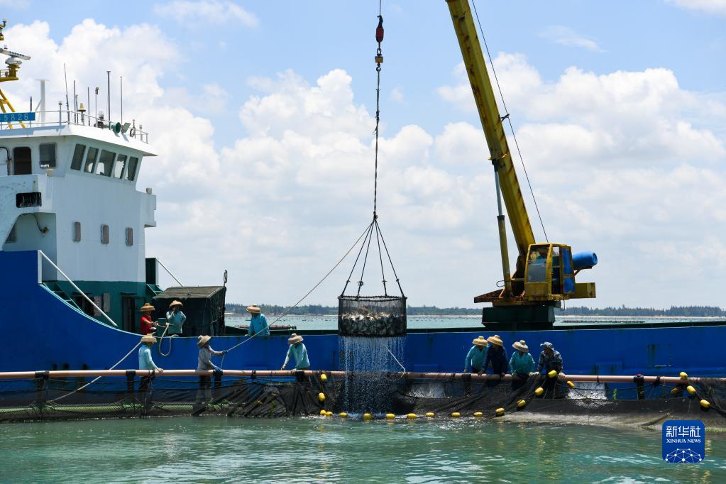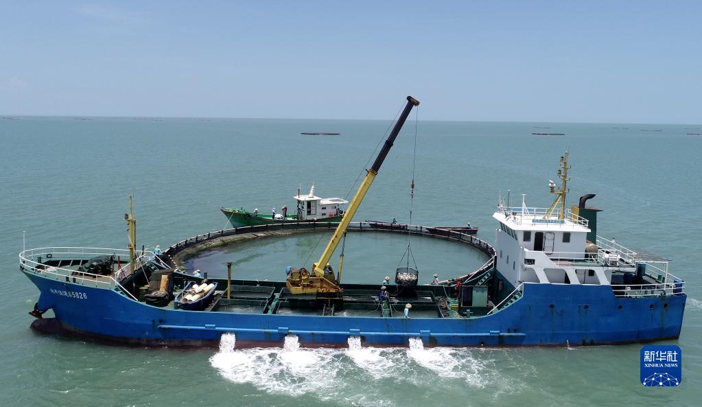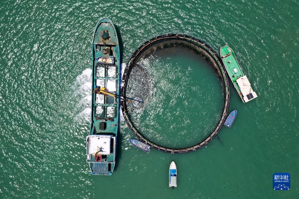 5月27日,在湛江市徐闻县西连镇,渔业工人将从深海网箱中打捞出的金鲳鱼放入运输船(无人机照片)。新华社记者 毛思倩 摄