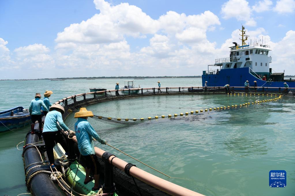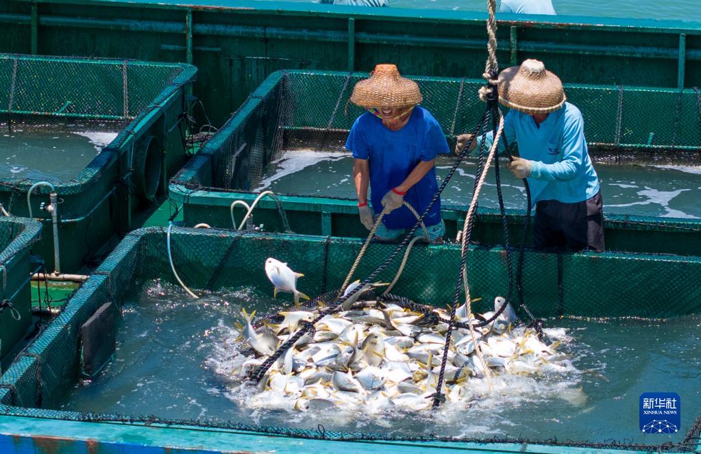 5月27日,在湛江市徐闻县西连镇,渔业工人在深海网箱拉网收获金鲳鱼。新华社记者 梁旭 摄