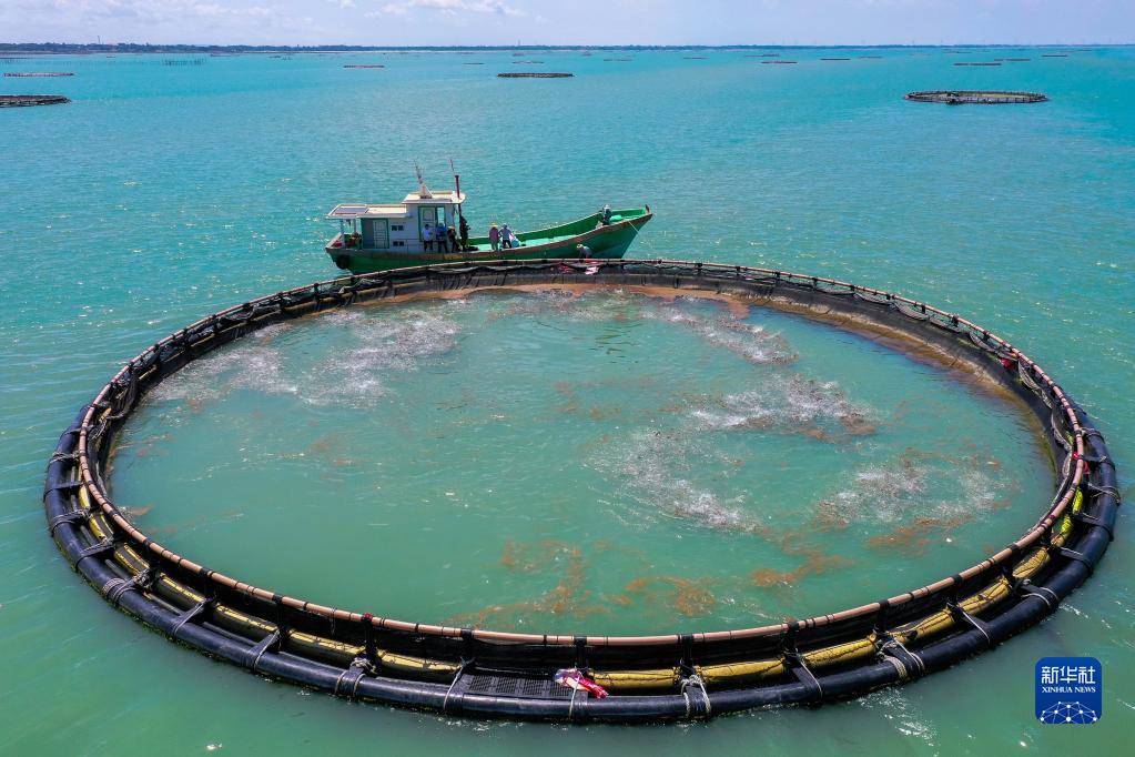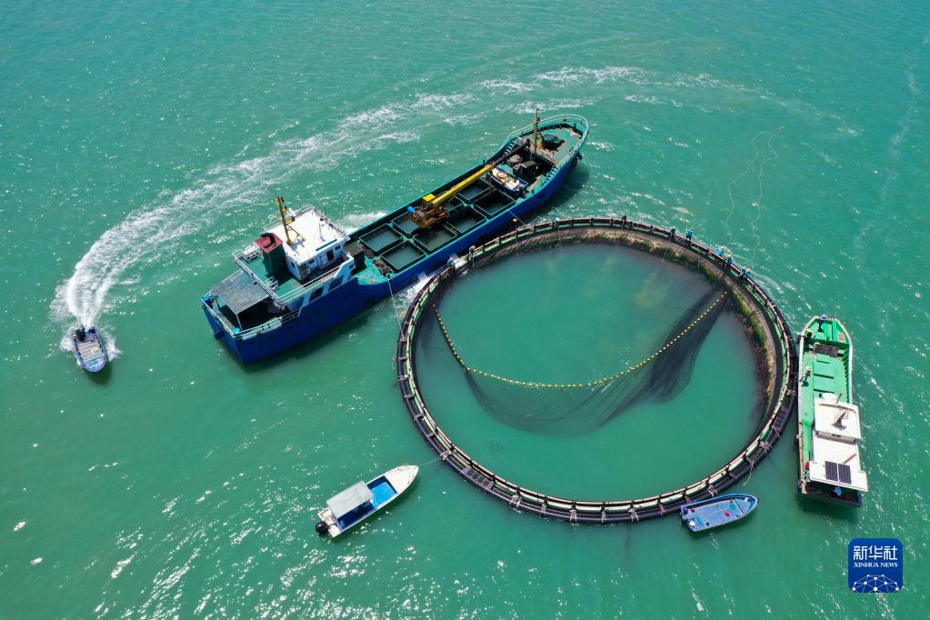 5月27日,在湛江市徐闻县西连镇,渔业工人从徐闻国桥深海养殖有限公司的金鲳鱼深海网箱捕鱼(无人机照片)。新华社记者 卢汉欣 摄
