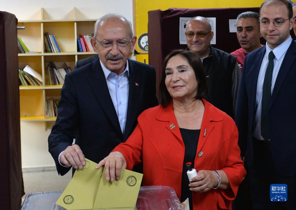 5月28日,土耳其反对党阵营“民族联盟”候选人克勒奇达尔奥卢(左一)在安卡拉参加投票。