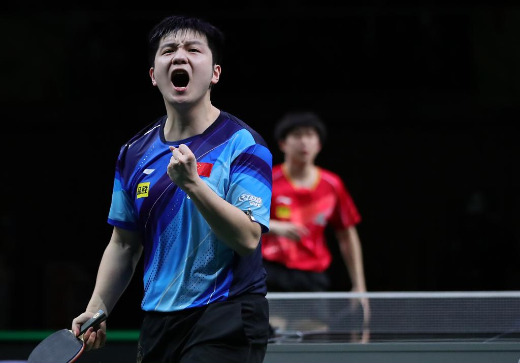 樊振东在与王楚钦的过往交手记录中以7:2领先。比赛中两人多次奉献高质量的多拍相持球,精彩场面让观众看得直呼过瘾。王楚钦一上来气势如虹,以11:8先下一城。樊振东从容应对,他以11:9、11:7、12:10连胜三局,并在第五局一度手握五个赛点,但均被王楚钦化解,后者以13:11逆转赢下本局。第六局樊振东没有再给对手太多机会,他以7:1开局,并以11:3锁定冠军。