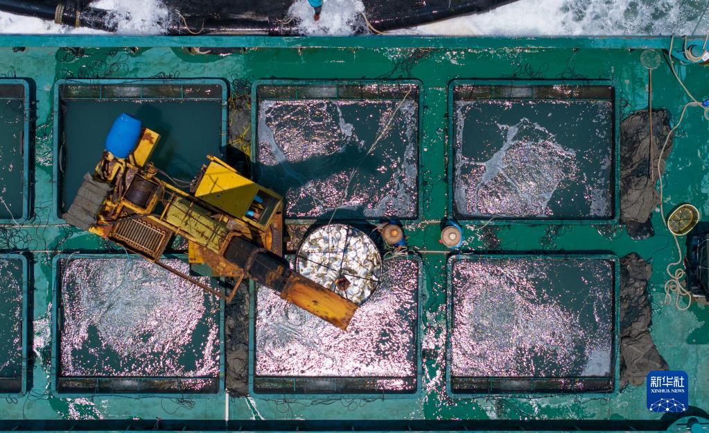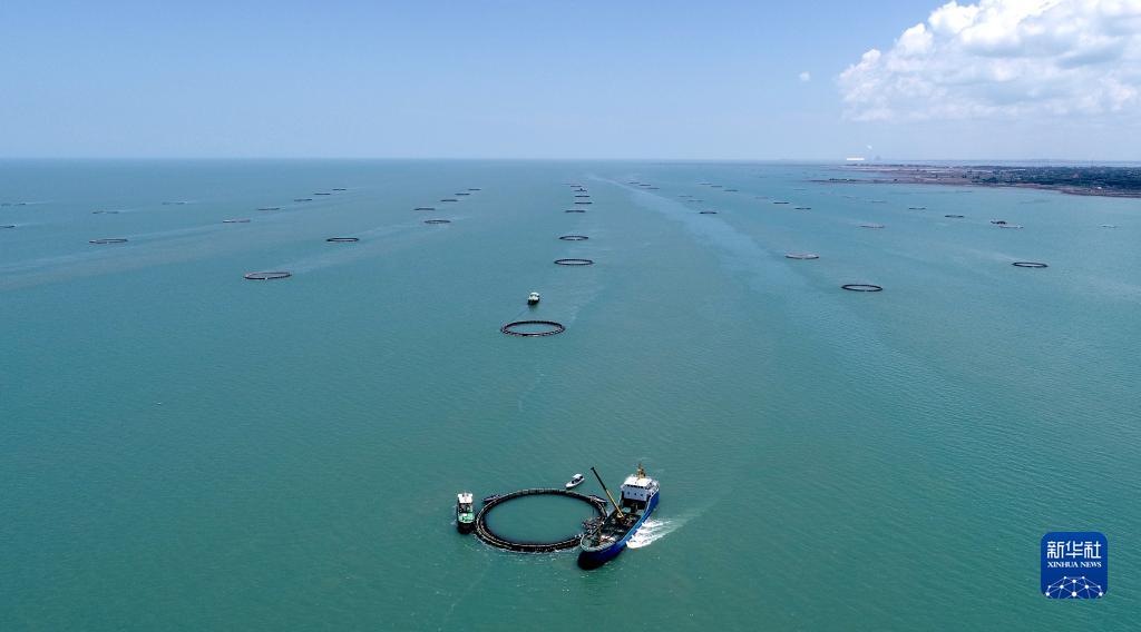 5月27日,在湛江市徐闻县西连镇,渔业工人从徐闻国桥深海养殖有限公司的金鲳鱼深海网箱捕鱼(无人机照片)。新华社记者 卢汉欣 摄