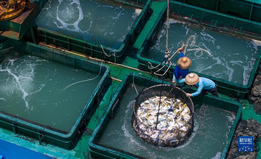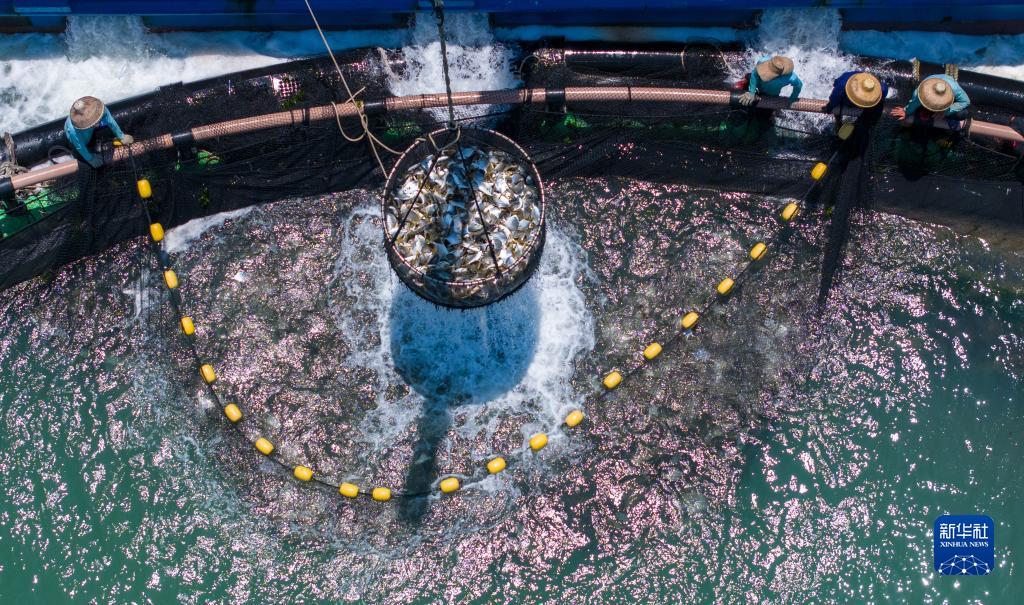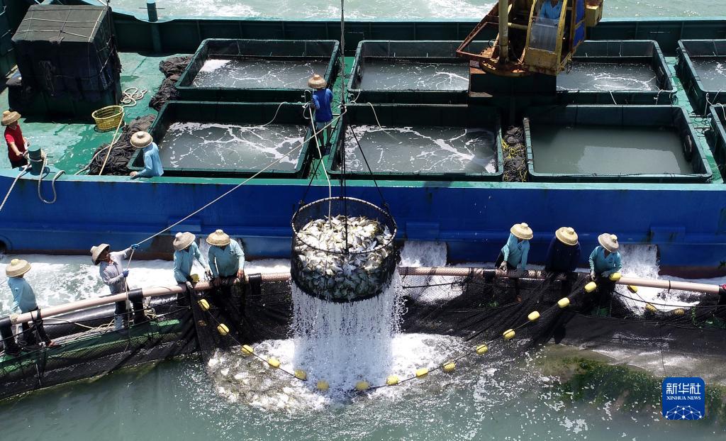 5月27日,在湛江市徐闻县西连镇,渔业工人在深海网箱拉网收获金鲳鱼。新华社记者 梁旭 摄
