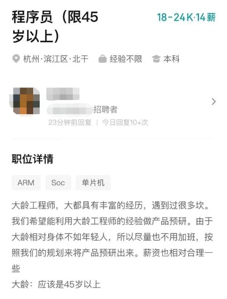 5月23日,有网友在某互联网大群看到,杭州市滨江区一家互联网公司打出一则招聘广告,点名要招45岁以上的大龄程序员,月薪18-24K,14薪,而且“尽量不用加班”,引来不少年轻程序员的围观。