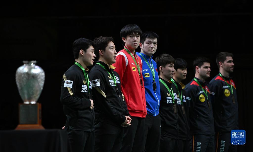 5月27日,冠军中国组合樊振东(左四)/王楚钦(左三)、亚军韩国组合张禹珍(左一)/林钟勋(左二)、季军韩国组合赵大成(右三)/李尚洙(右四)和德国组合奥夫恰罗夫(右二)/弗朗齐丝卡在颁奖仪式上。新华社记者 陶希夷 摄