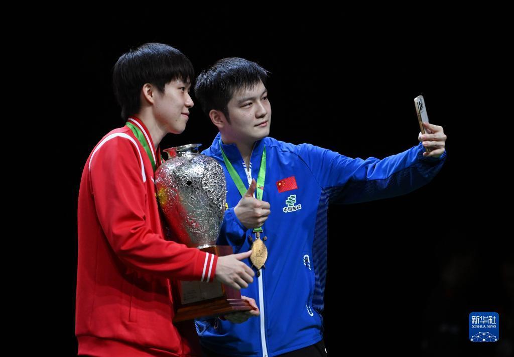 5月27日,樊振东(右)/王楚钦在颁奖仪式上合影留念。新华社记者 陶希夷 摄