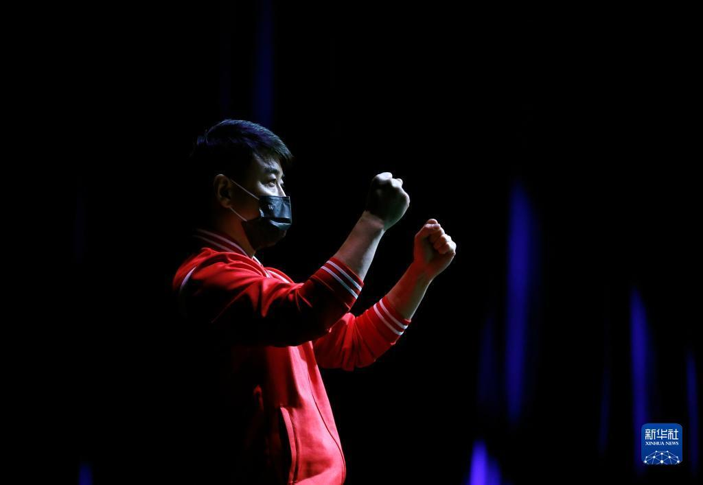 5月27日,教练王皓庆祝樊振东/王楚钦得分。新华社记者 王东震 摄