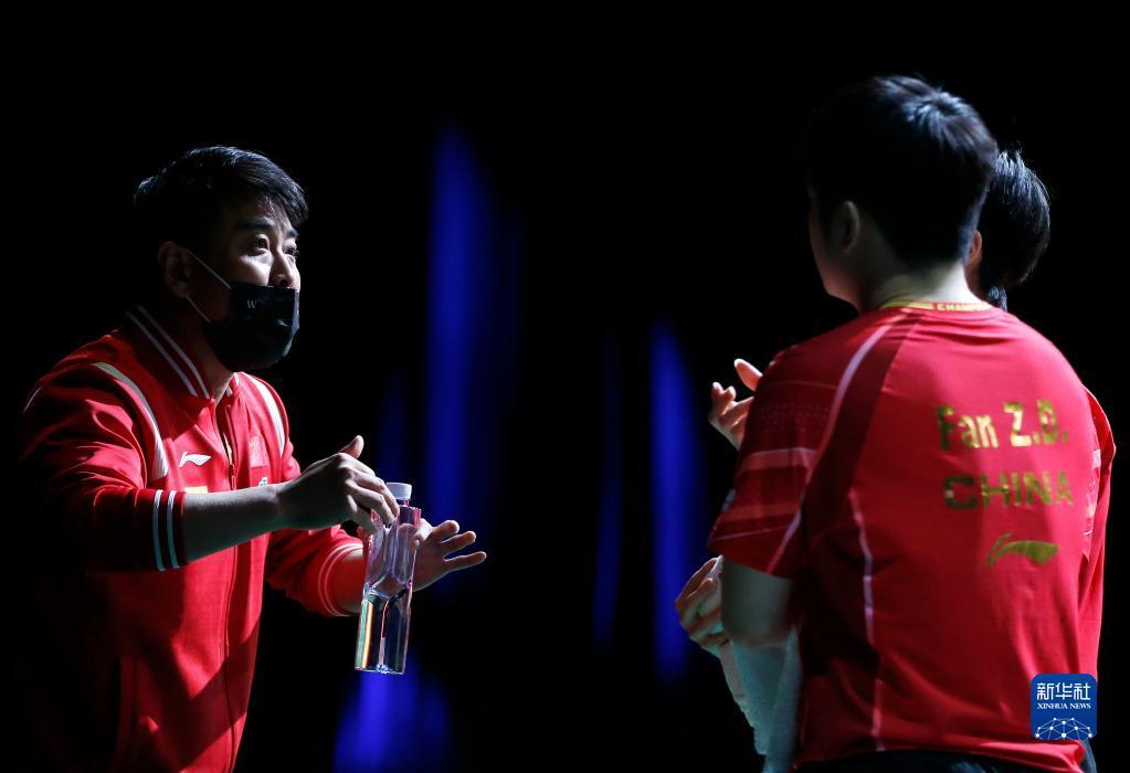 5月27日,教练王皓(左)在比赛间隙指导樊振东/王楚钦。新华社记者 王东震 摄