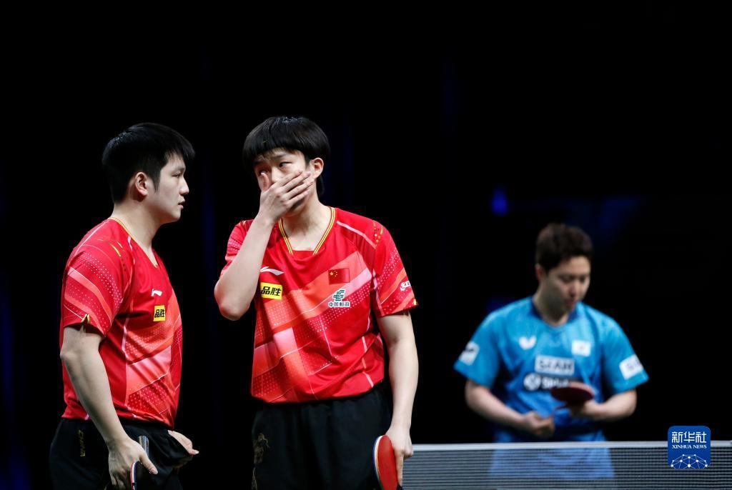5月27日,樊振东(左)/王楚钦在比赛中交流。新华社记者 王东震 摄
